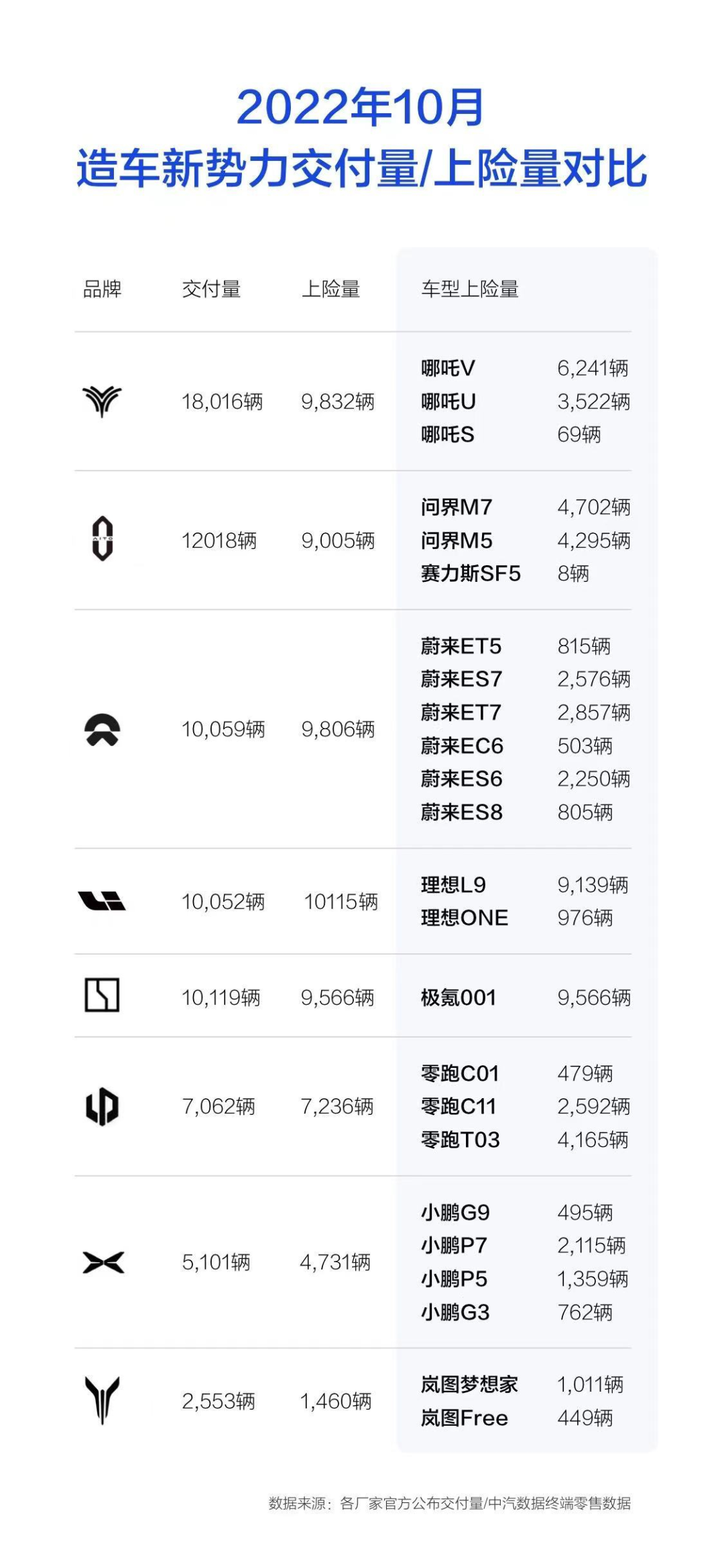 蔚来10月交付10059辆,上险量9806辆,两者相差253辆,非常接近。理想10月交付10052辆,但上险量为10115辆,实现了对交付量的反超。