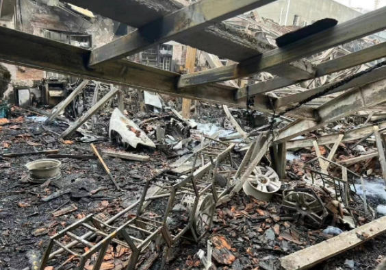 火灾现场一片狼藉,钢质结构的框架坍倒一旁,大部分汽车被烧得面目全非,甚至辨认不出车型,车轮等汽车配件烧得只剩金属框架。