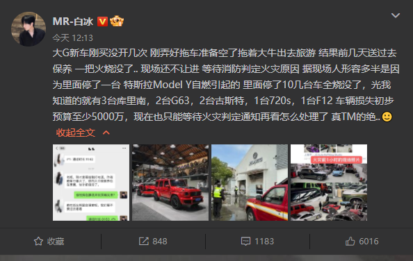 “光我知道的就有3台库里南,2台G63,2台古斯特,1台720s,1台F12 车辆损失初步预算至少5000万”