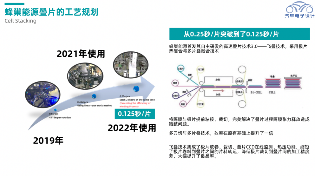 在目前这个时间节点,蜂巢自主研发的高速叠片技术3.0,采用极片热复合与多片叠融合技术,通过技术创新在效率方面实现了颠覆性的突破——实现了0.125秒/片的叠片速度。这就使得整体的中段工艺得到了简化,单位占地节省40%以上。同时,效率和精确性的提高,也解决了隔膜褶皱、对齐度不良等缺陷控制与监测痛点问题。