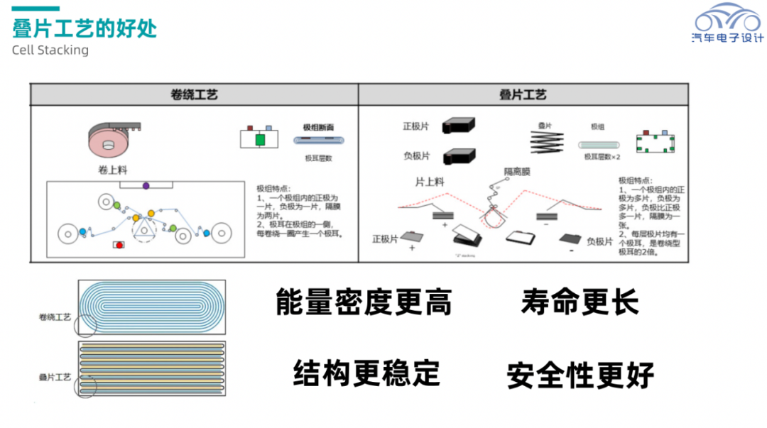 从最终电池产品来看,叠片形成的电池产品,能量密度更高、内部结构更稳定、安全性更高和寿命更长。