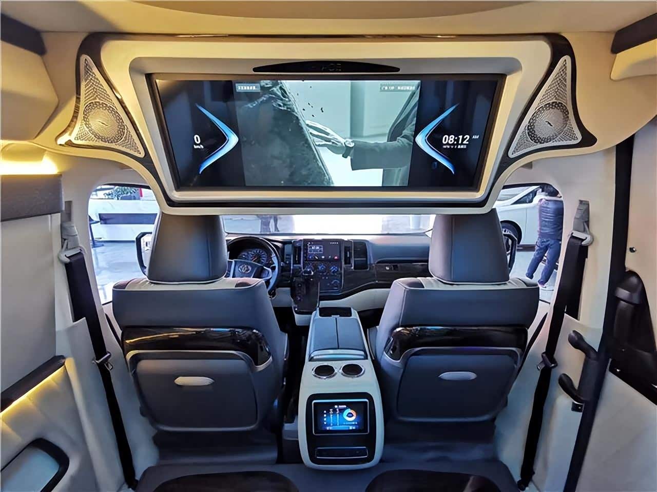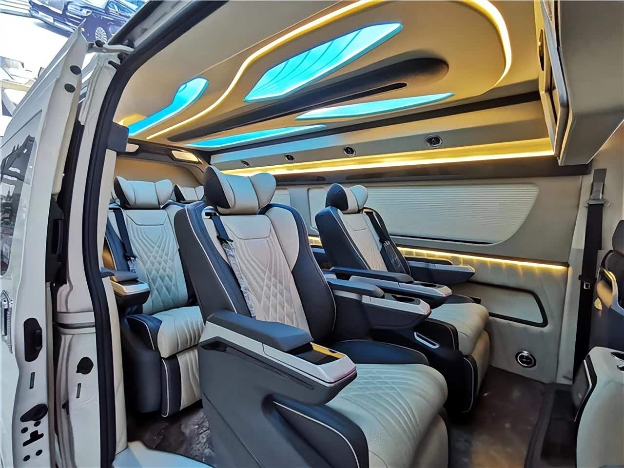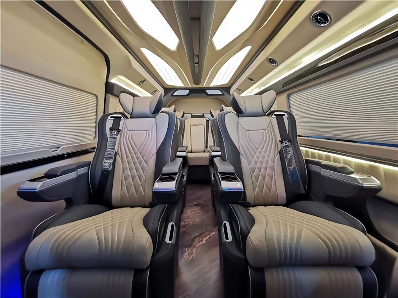 地板部分采用游艇级的柚木地板,档次很好,方便打理。侧壁更换意大利顶级真皮包裹手感极佳,侧壁菱形格的设计使整车层次分明立体感更强。侧窗豪华电动窗帘,面料阻燃隔热、隔光、隔音。顶棚更换意大利顶级麂皮绒零污染零伤害的环保材质,搭配桃木件及氛围灯的组合,营造出温馨舒适的乘车环境。