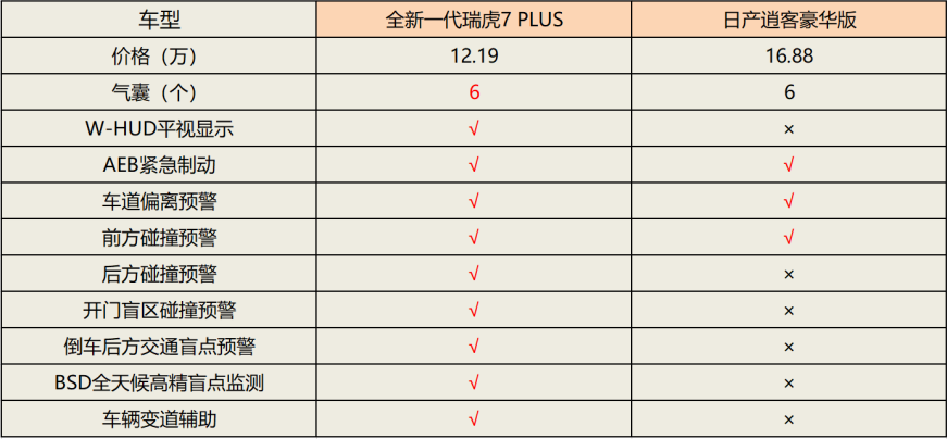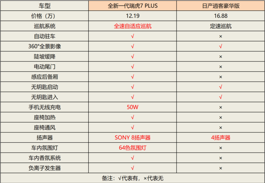 正如上图所示,相较于日产逍客,全新一代瑞虎7 PLUS不仅安全配置更足、更全面,同时舒适性配置也是明显领先,而这正是意味着全新一代瑞虎7 PLUS用起来还会更加舒适。比如,全新一代瑞虎7 PLUS多出了负离子发生器,可让车内空气始终清晰与健康;多出了香氛系统,能营造出品质感满满的座舱环境;用上了SONY扬声器,听歌、伴奏的效果都会十分优质;有着座椅加热和通风,能带来冬暖夏凉的乘坐体验。