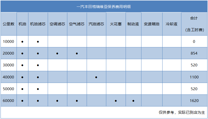 在保养费用方面,我们抛开厂家和经销商给出的一些保养优惠政策不谈。根据一汽丰田的保养手册显示,一汽丰田格瑞维亚的首保时间为10000公里,其首保免费,之后的保养间隔为同样为为10000公里。那么,如果大致按照6年总行驶60000万公里的情况下,格瑞维亚总保养费用是4614元,以每年1万公里的驾驶里程计算,平均每一年成本约为769元。可以看到,作为一款中高端MPV车型,其保养价格并不贵。