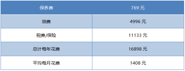 其次,保险缴纳车损险与第三者责任险100万再加不计免赔的计算方式,以及加上未出险情况下,保费第二年8折,第三年7折,取三年保费的平均值,这些条件一并来计算格瑞维亚每年的用车成本总计为16898元,平均每月花费为1408元。具体如以下表格: