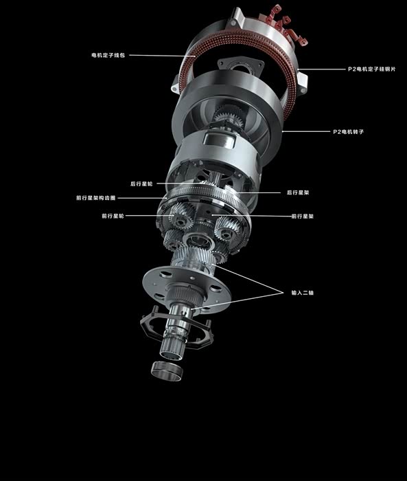 比亚迪1.5T发动机和基于扁线绕组技术的EHS双电机传动系统,p1、p2电机均为自研,单级减速器由传统变速箱改造,具备了串并联的模式。