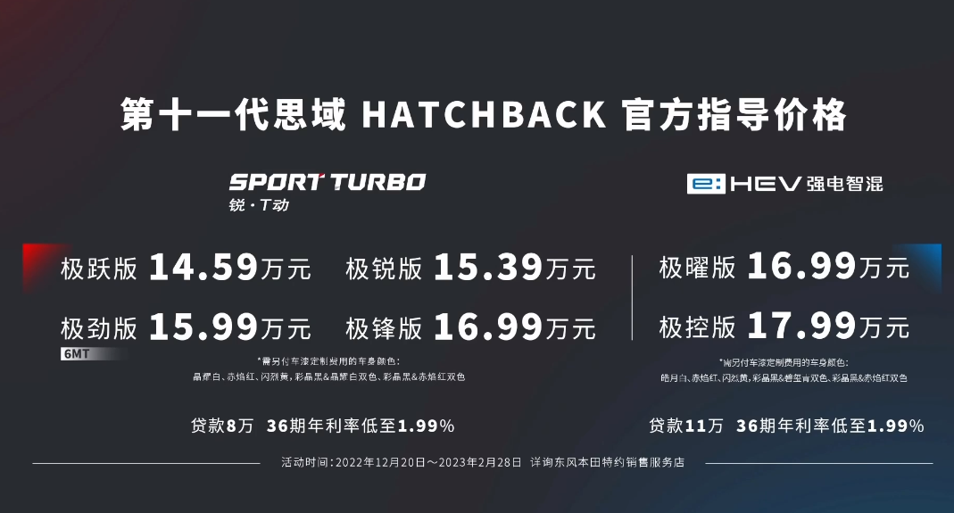 本田思域两厢版终于上市了!售价14.59-17.99万元,共6款车型。新车除了具有更运动的溜背造型,动力方面还同时提供了1.5T和2.0L混动两种选择。那么,新款思域两厢版还有哪些看点?哪款配置最适合我呢?本文将逐一解答。