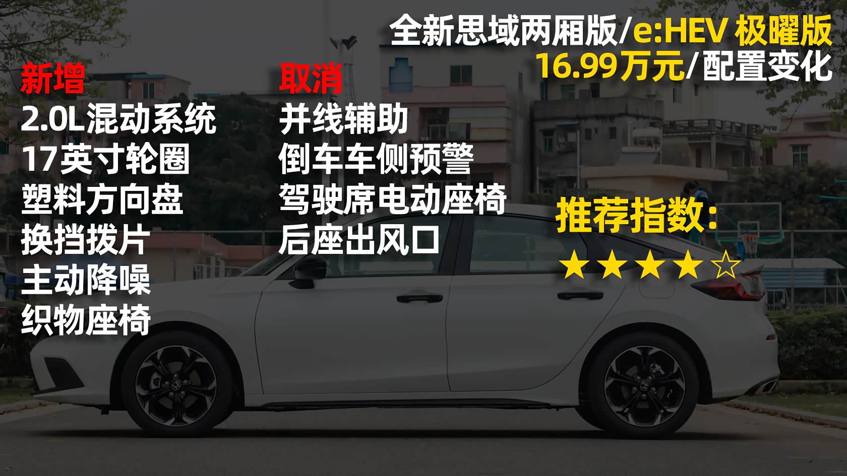 配置解读:配备2.0L混动系统、17英寸轮圈、塑料方向盘、换挡拨片、主动降噪、织物座椅。取消并线辅助、倒车车侧预警、驾驶席电动座椅、后座出风口。