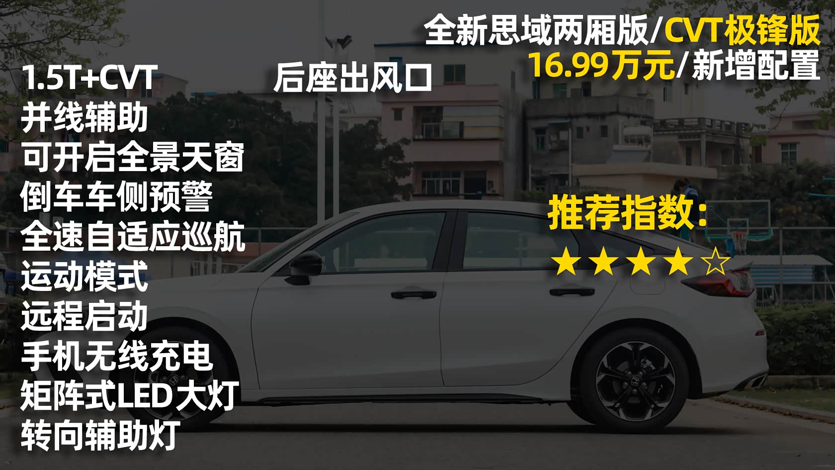 配置解读:1.5T+CVT动力组合、并线辅助、可开启全景天窗、倒车车侧预警、全速自适应巡航、运动模式、远程启动、手机无线充电、矩阵式LED大灯、转向辅助灯、后座出风口。