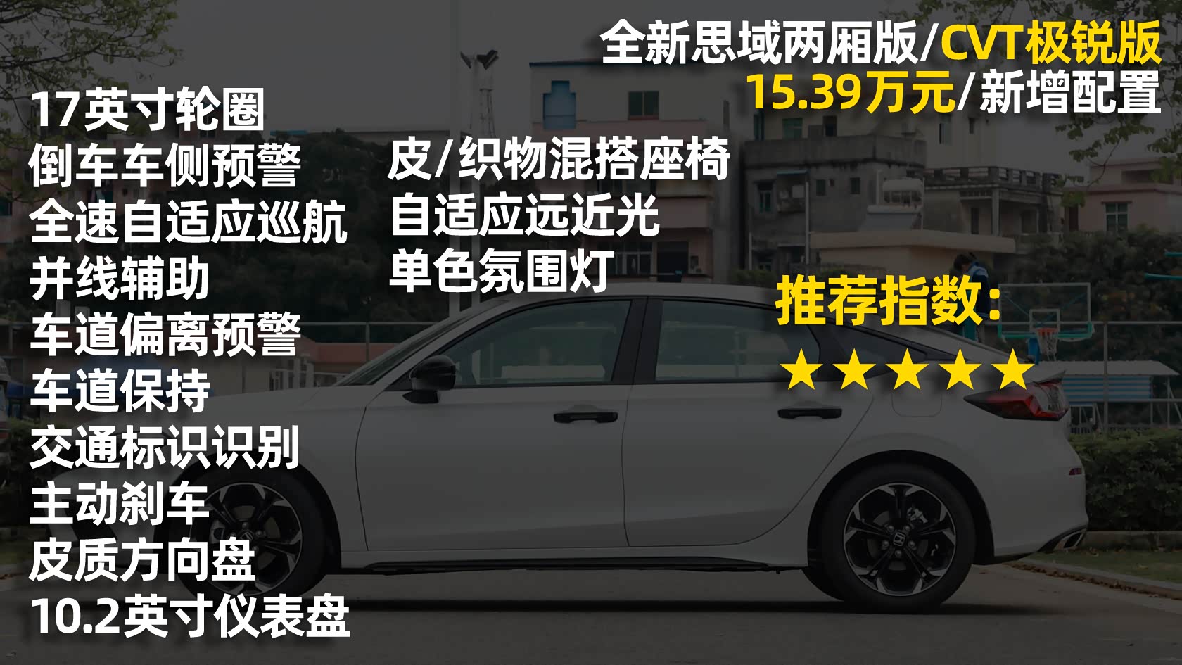 配置解读:新增了17英寸轮圈、倒车车侧预警、全速自适应巡航、并线辅助、车道偏离预警、车道保持、交通标识识别、主动刹车、皮质方向盘、10.2英寸全液晶仪表盘、皮/织物混搭座椅、自适应远近光、单色氛围灯。