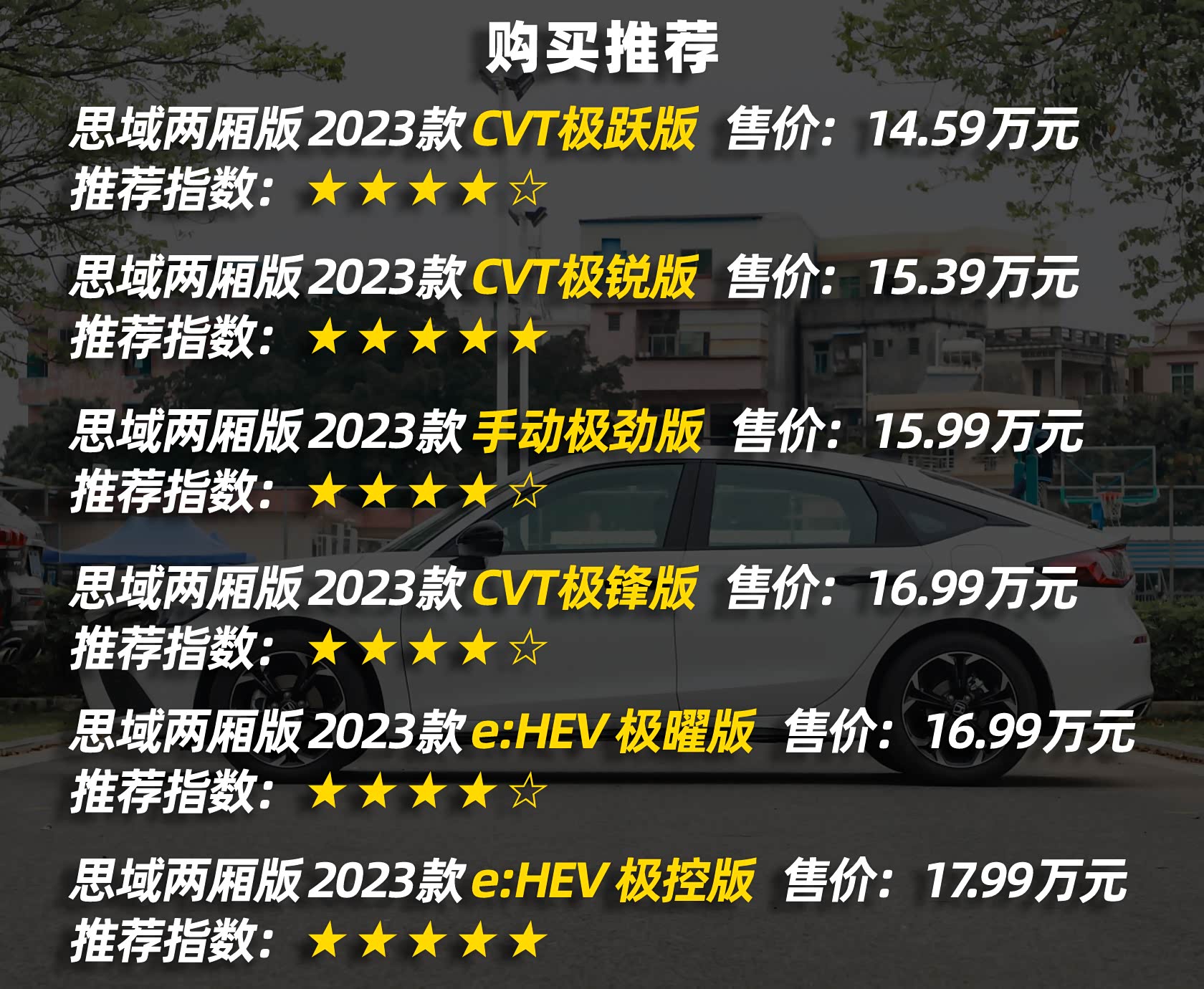全新思域两厢版的推出,进一步丰富了第十一代思域的选择,1.5T和2.0L e:HEV两种动力能够满足不同需求的消费者。如果你的预算适中,想买一台各方面适中的车型,那我们优先推荐CVT极锐版;如果你需要更强一些的动力,此时2.0L的e:HEV极控版就很适合你,虽然不便宜。