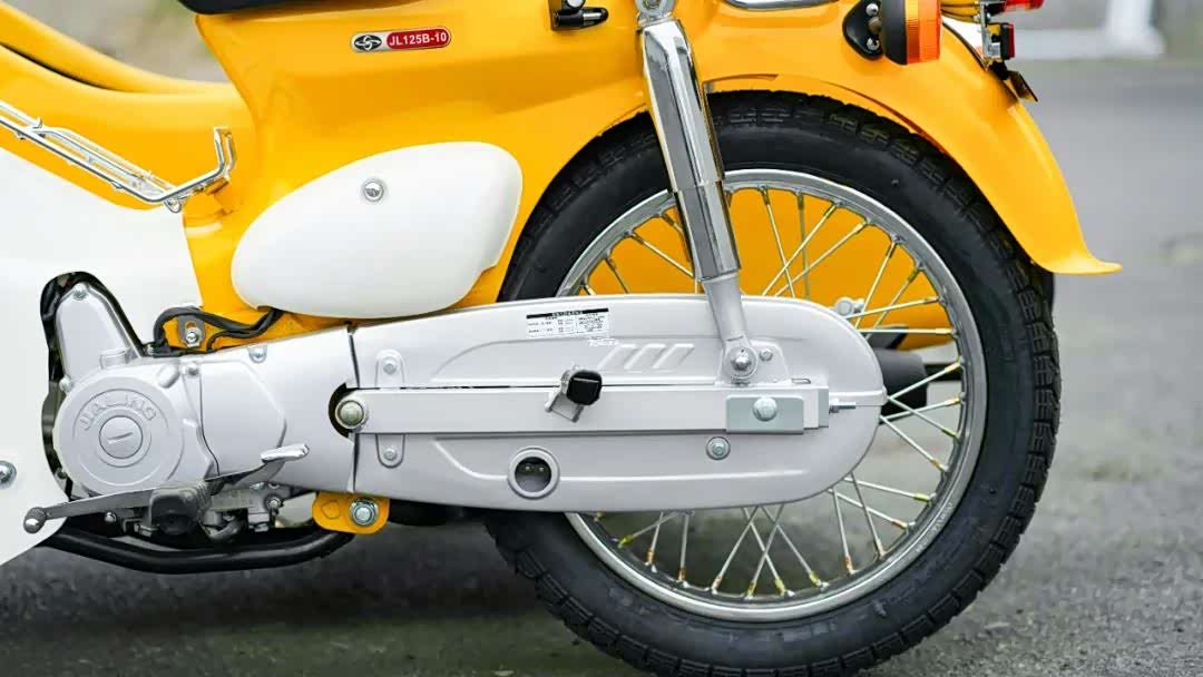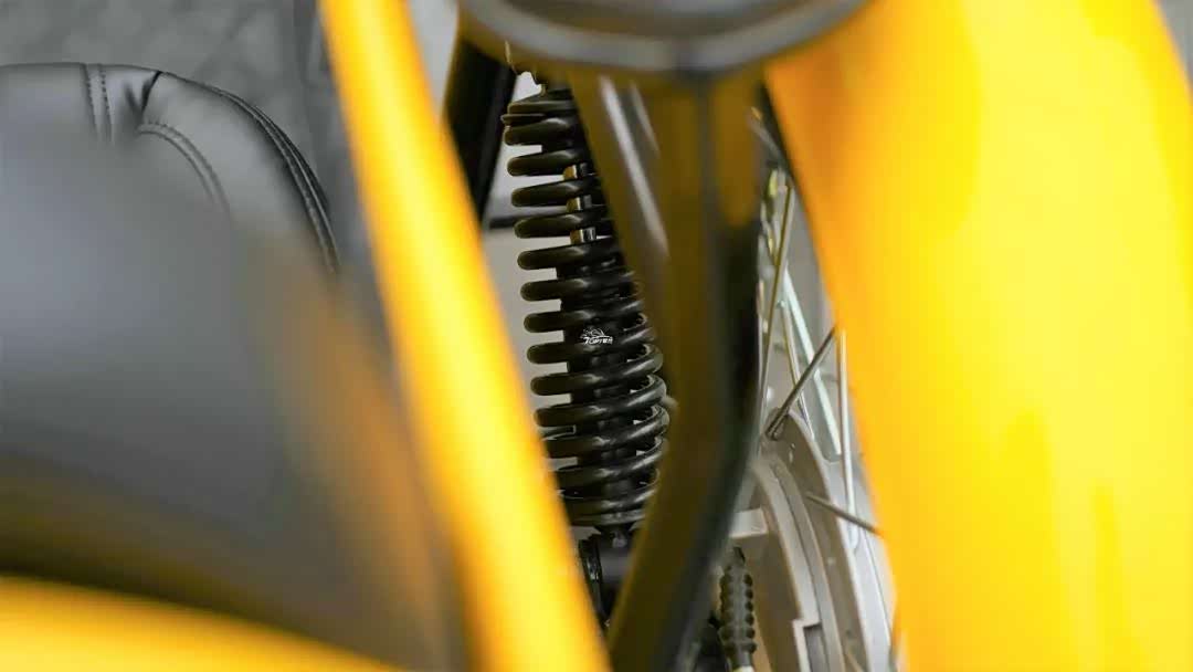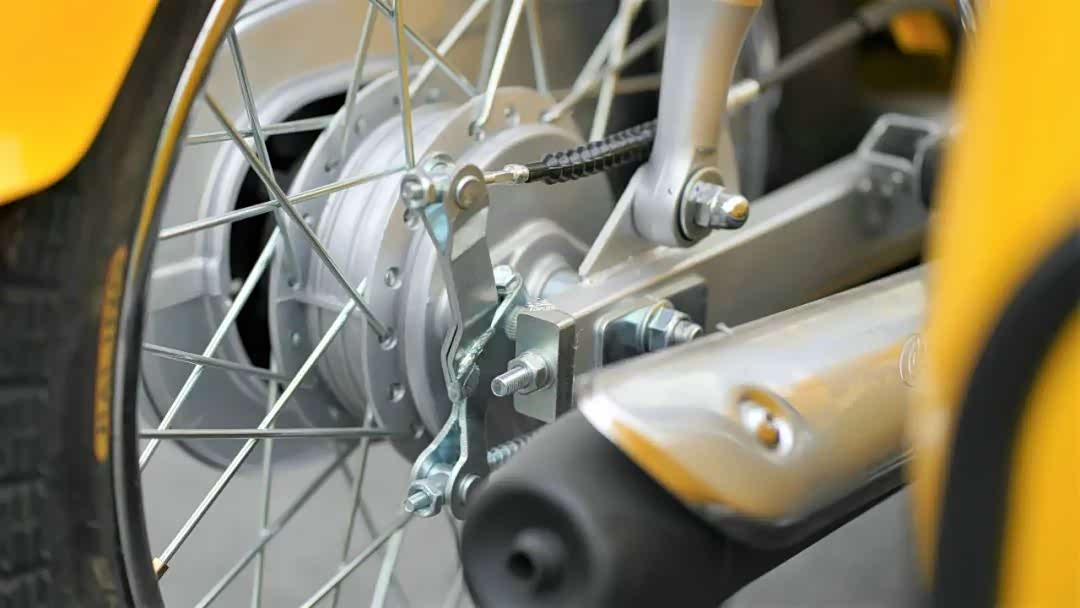 减震部分,CoCo边三轮的主车与CoCo弯梁无异,传统的正立式前叉,采用独特的多连杆软连接,虽然有助于提升舒适性,但是对通过性并不友好。双边后减震是全镀铬的套筒形式,搭配“全包围的链条”那是相当有年代感。