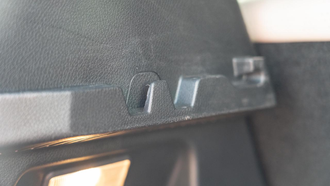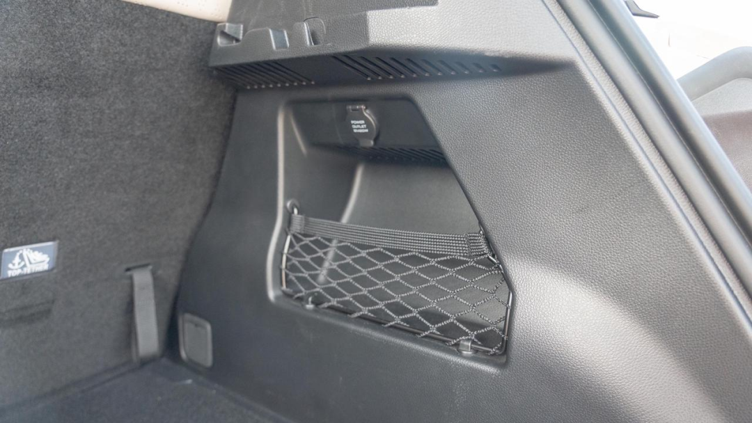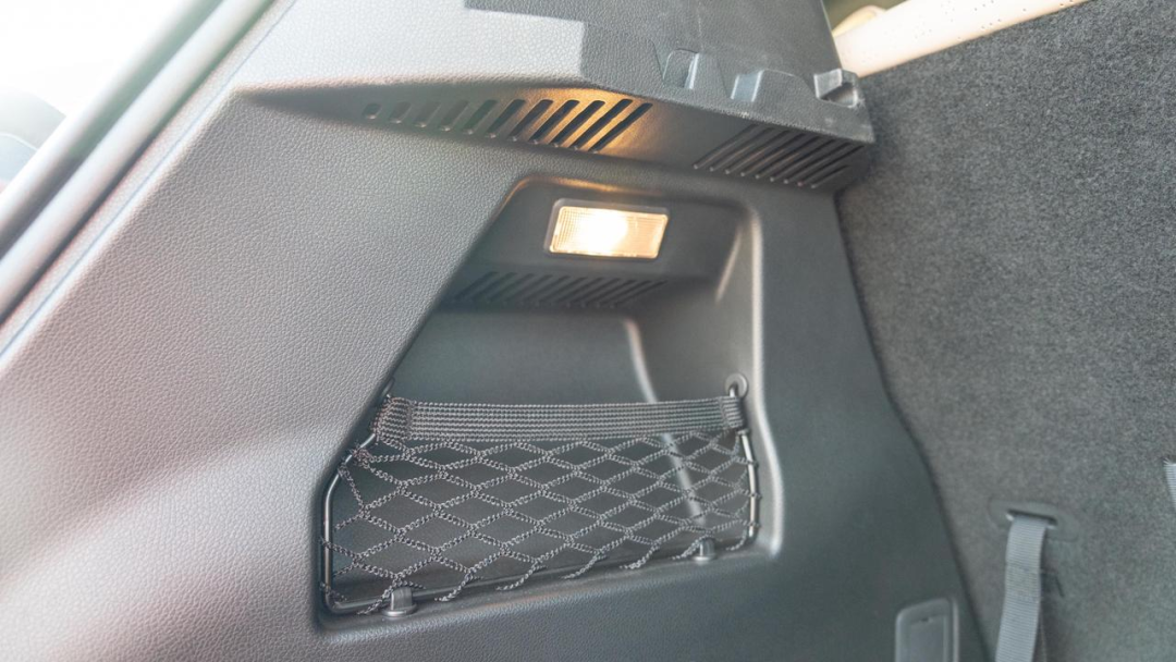 后备箱左侧有一个照明灯和一个小网兜,可以放置一些小件物品,照明灯上方还有一个三角形挂钩。