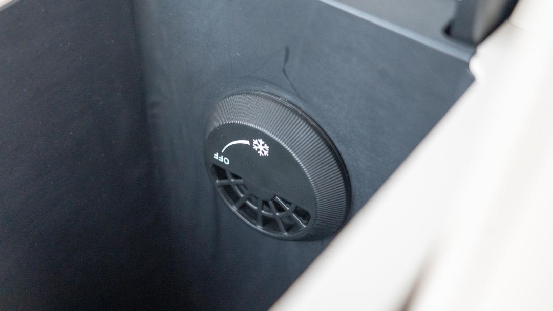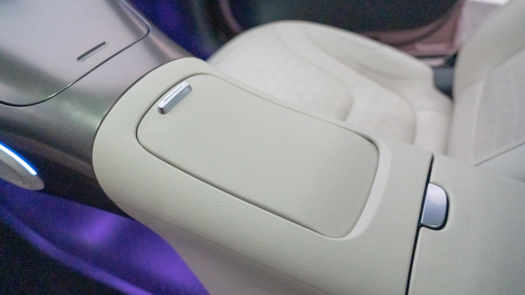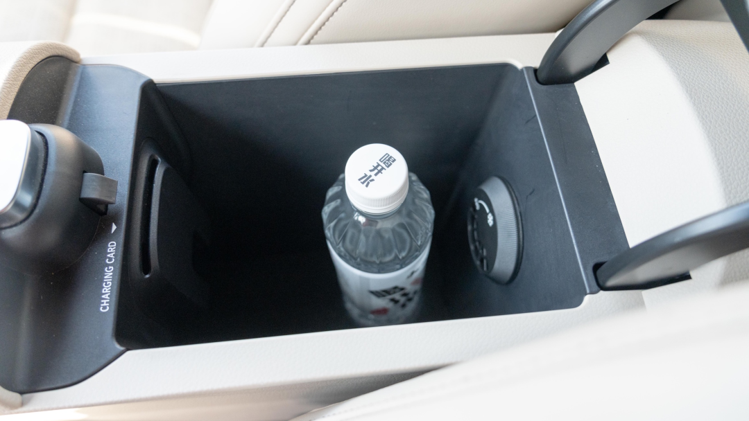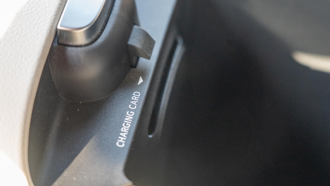 另外扶手箱内还有两个小细节,首先靠近卡扣的位置可以看到「CHARGING CARD」字样,这里特意为卡片钥匙挖出了一块放置区,可以说是非常人性化了。另外在扶手箱的另一侧,有一个可关闭的空调出风口。如果有一些需要保持冷藏的物体,可以临时放置在中央扶手箱内。