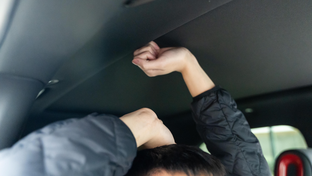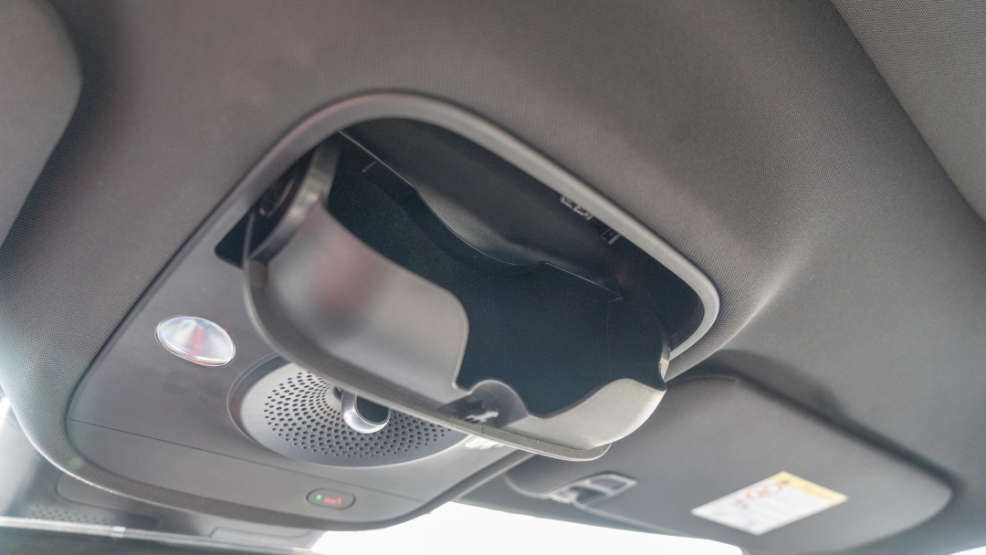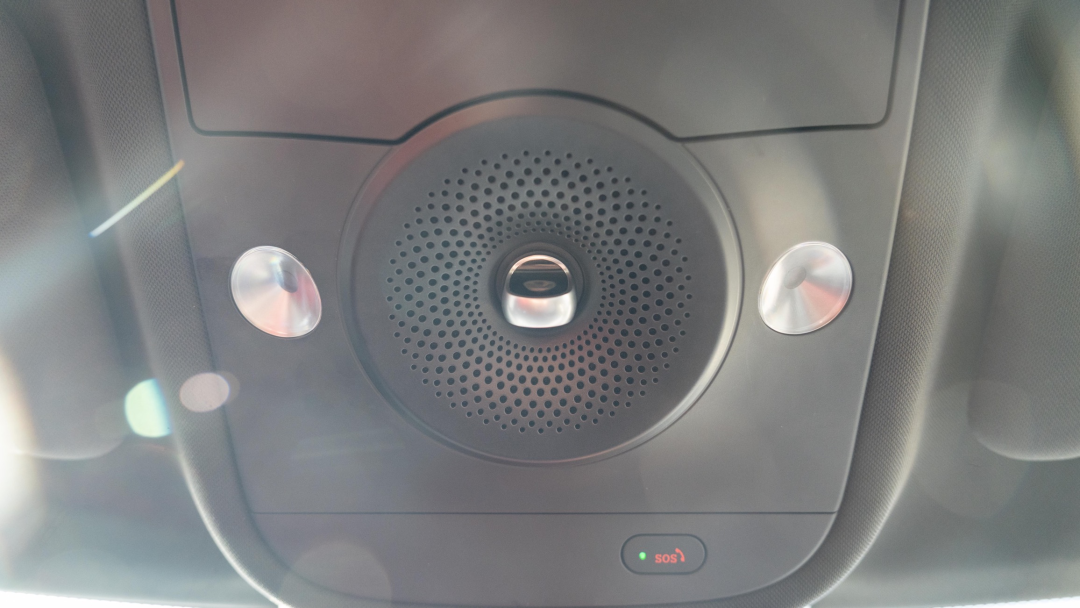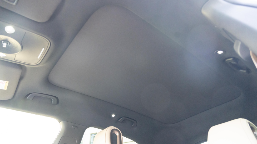 顶部中央区域较为简洁,左右为阅读灯,灯光为暖黄色,亮度不算高。中央是遮阳帘的开关,下方还有 SOS 求救按钮。除此之外还有一个眼镜盒,这点对于喜欢戴墨镜开车的人会方便许多。
