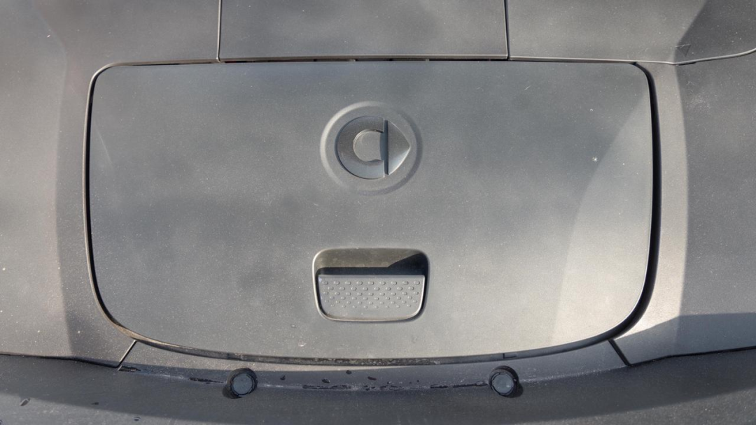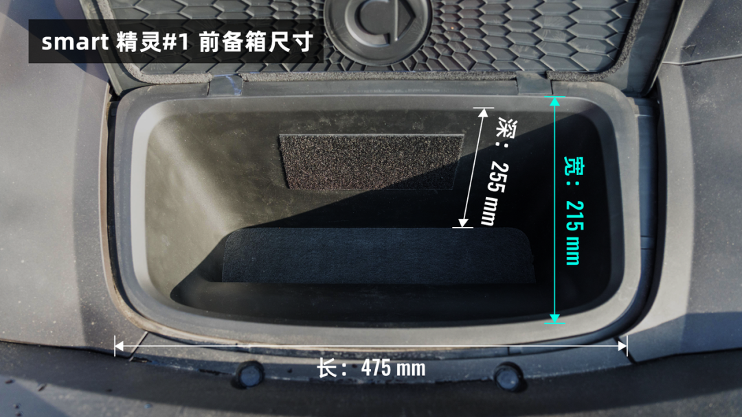 打开前舱盖,会比较容易将这个带有 smart 标志的盖子忽略,其实这是精灵 #1 的前备箱保护盖。打开后就能看到前备厢了,官方的演示图片中仅能放下一个装着便携充电器的包,从实际测量的尺寸上也能看出确实不大。