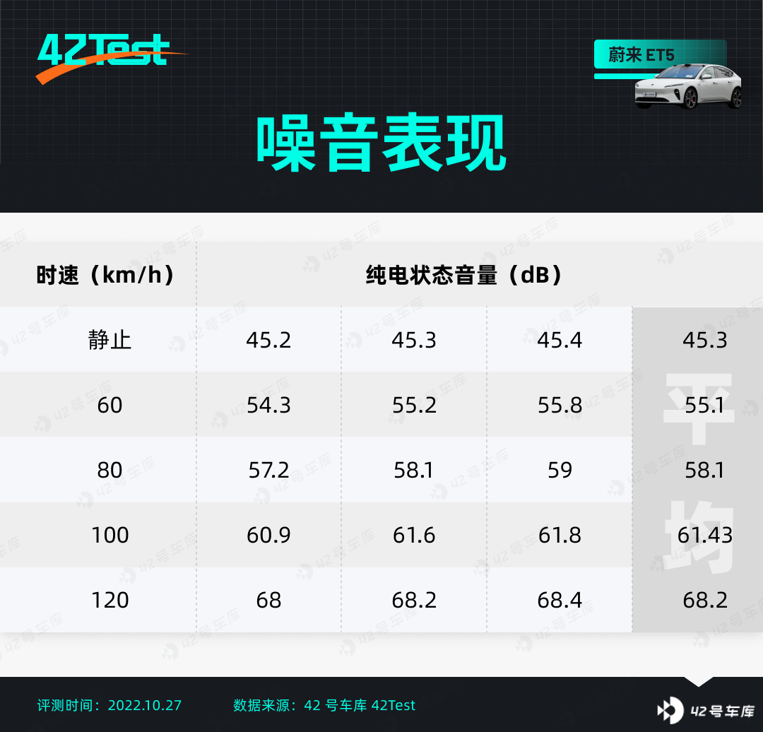 按照惯例,噪音实测环节我们会关闭所有车窗、空调、音响、座椅按摩、驾驶辅助等有声响功能,同时清空车上物品保证不影响测试结果。随后在封闭道路内以 0、60、80、100、120 km/h 的时速行驶,分别对驾驶员耳边的噪音采集三次样本取平均值,具体结果如下。
