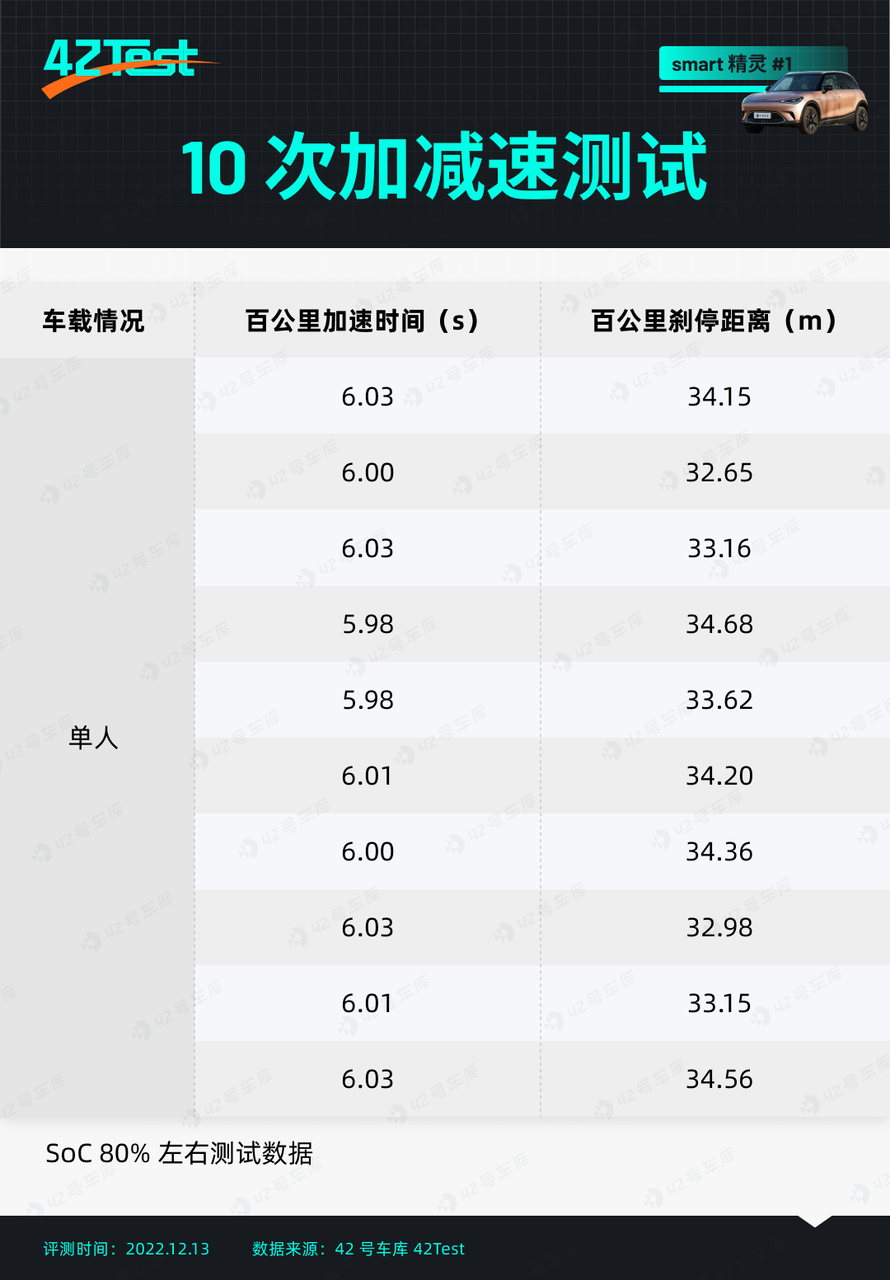 百公里加速的数据非常有意思,10 次测试下来数据非常稳定,成绩都在 6 s 左右。这与官方 6.7 s 的数据显然有一定的差距,难道 smart 测试时也采用的「半载工况」?不过即使是运动模式的全力加速,精灵 #1 的动力输出也十分线性,车辆抬头感并不明显,只有推背感和仪表上不断上升的时速在告诉你,车辆确实在全力加速。