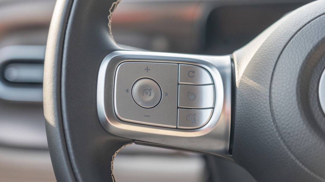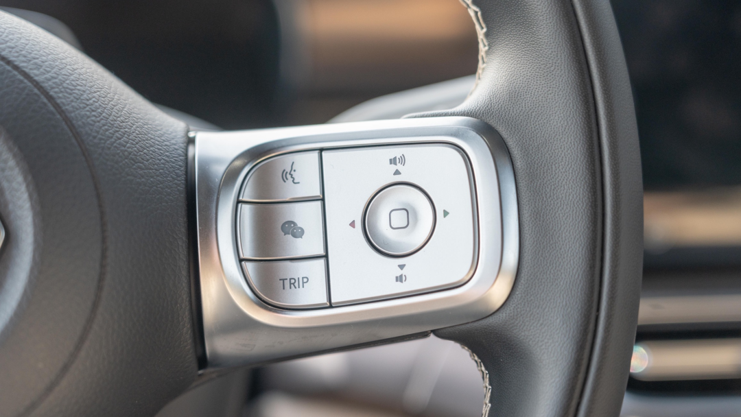 方向盘左侧为辅助驾驶相关控制按钮,这个我在辅助驾驶部分会详细说。右侧为多媒体控制按键、语音唤醒按键、微信功能按键以及切换仪表小计里程显示按键。