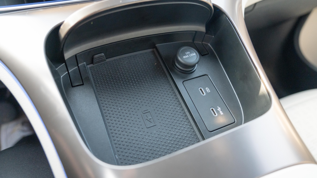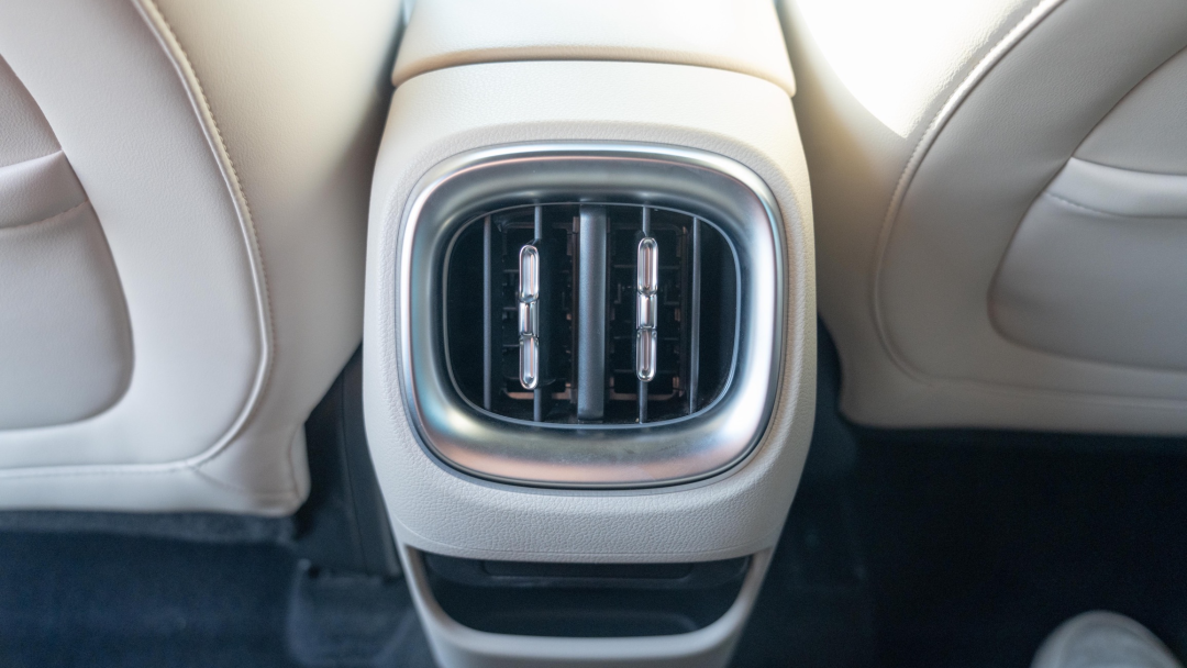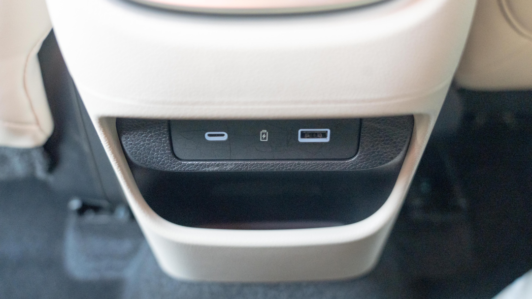 后排中央扶手下末端有独立空调出风口,下方有一个 Type C 口和一个 Type A 口用于充电,还有一个小小的储物槽可以放置手机。