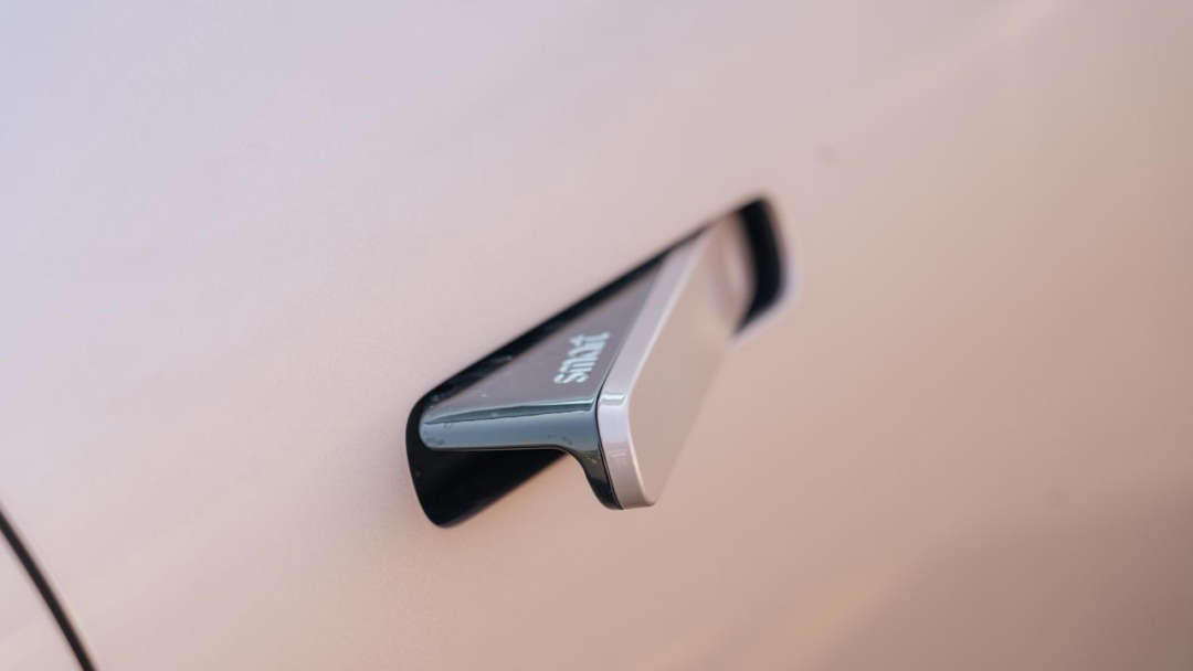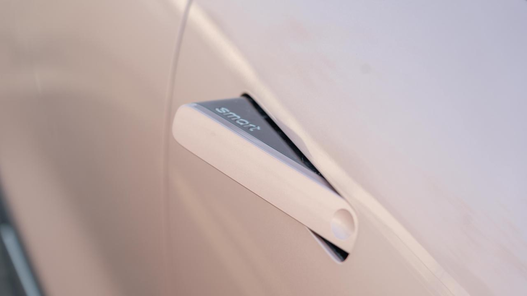 门把手采用了隐藏式的设计,但与大部分的隐藏式有所不同。当带着钥匙靠近车辆时,轻触门把手的圆形凹陷部分,门把手会自动弹出。弹出后可以看到,隐藏在门把手中的 smart 字母,又是设计师的小心思。