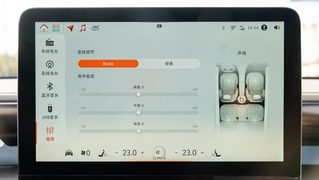 Premium 版车型采用了 13 扬声器的 Beats 音响,比其他版本 5 个扬声器多了不少。实际听感上,毕竟是 Beats 音响,低音部分表现不错。如果不喜欢默认的调音风格,还可以在车机中自行调节 EQ 均衡器,非常自由。