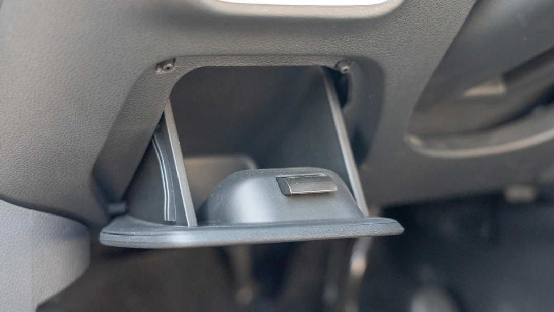 按键下方有一个小小的储物格,适合放置一些票据,以及经过高速人工收费口的时候放置感应卡。再往下靠近左脚边,可以看到前舱盖的开启开关。