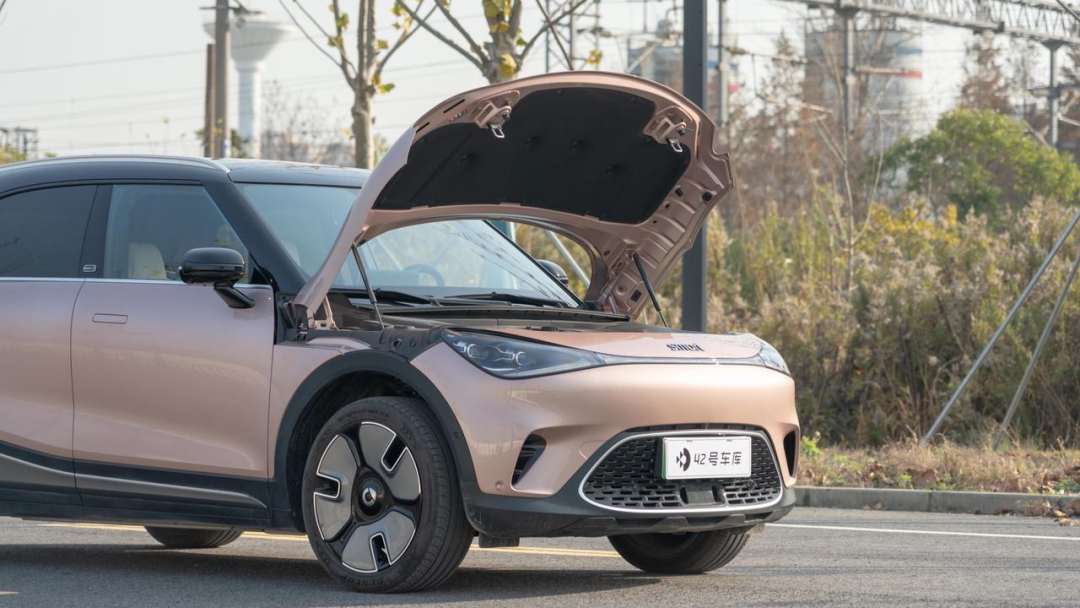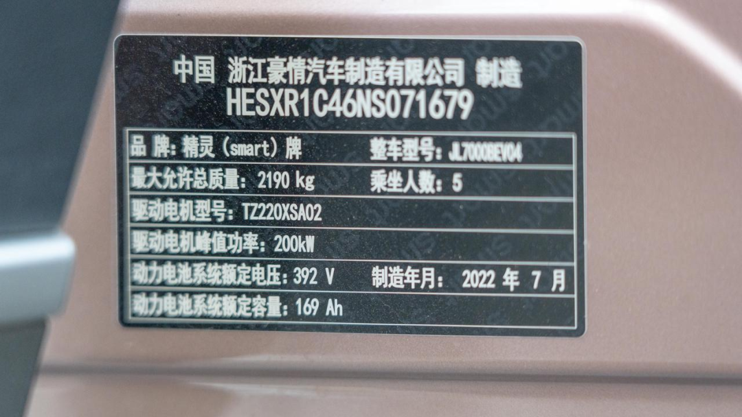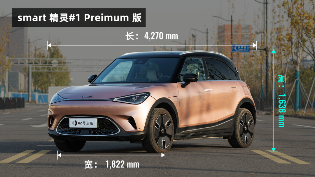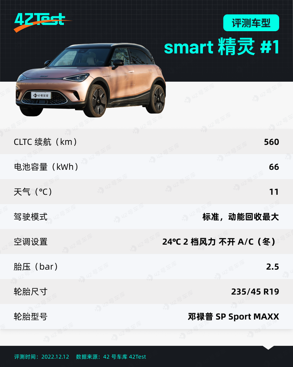 本次 42Test 的车型版本是 smart 精灵 #1 Premium 版本,电池为 66 kWh 的三元锂电池,官方 CLTC 综合工况续航 560 km,标配 19 英寸转子低风阻轮毂。