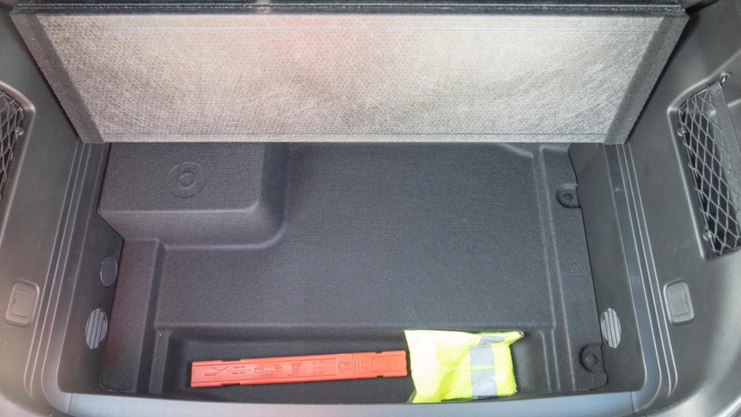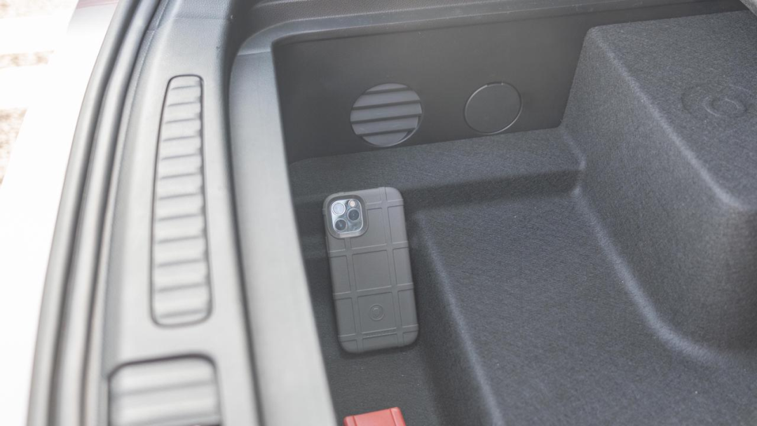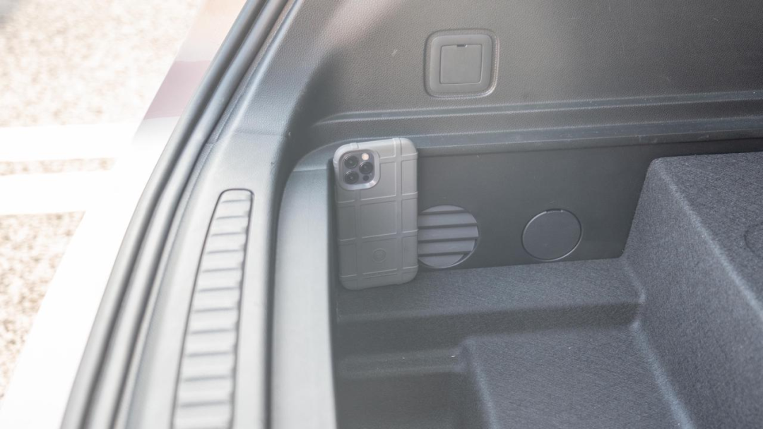 掀开后备箱的隔板,下方除了放置应急的工具,还有相当可观的空间。拿一台 iPhone 进行演示,可以看到下方的深度大约为 iPhone 13 Pro 长度的 1.5—2 倍,除了应急工具外还可以放一些不常用的物品,弥补了前备箱较小的缺点。
