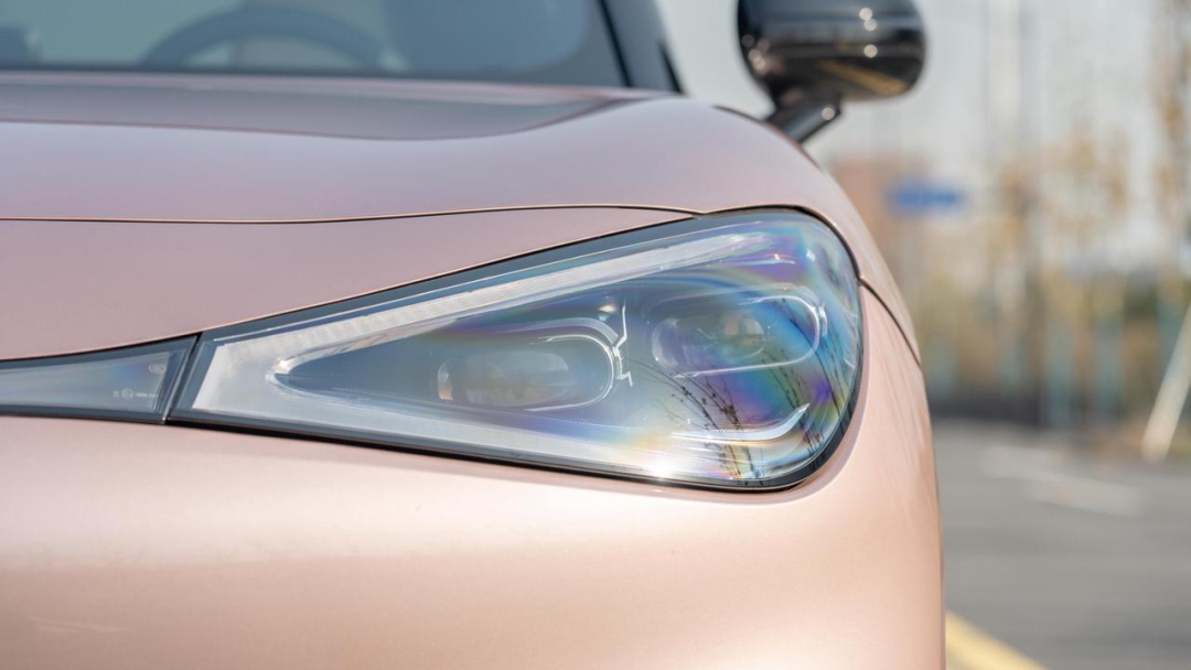 来到侧面,可以看出精灵 #1 的车头相较于整个车身还是比较长的。车漆颜色搭配黑色的车顶,外加车窗镀铬条和车顶行李架的银色点缀,整体颜色搭配非常和谐。而波普粉这个颜色据官方统计,不仅很受女车主欢迎,很多男车主也喜欢这个颜色。