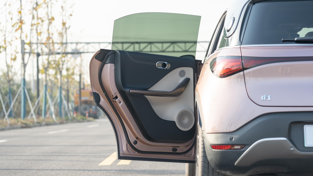 后排依然是无框车门设计,整体风格与前排一致,区别是车门上多了一个中音喇叭和一个低音喇叭。后排的车窗是无法完全降下的,车窗降至最低后,如图所示约有 1/3 无法下降。