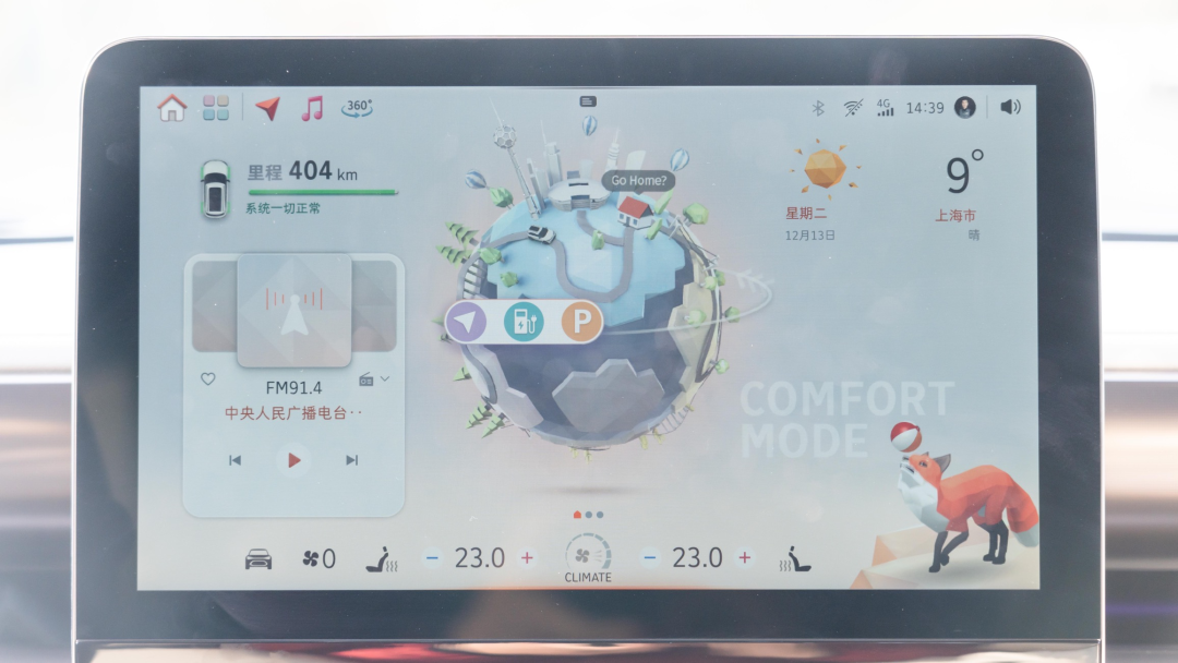 精灵 #1 的中控车机系统看起来完全不像过去的传统车企车机,主界面隐隐透露出一股安卓平板的感觉。屏幕最上方是一排快捷按钮,中间的主页面堆满了各种控件,不过不支持自定义摆放位置,希望后续可以支持。最下方左侧是车辆设置按钮,其他是空调和座椅加热相关的功能。