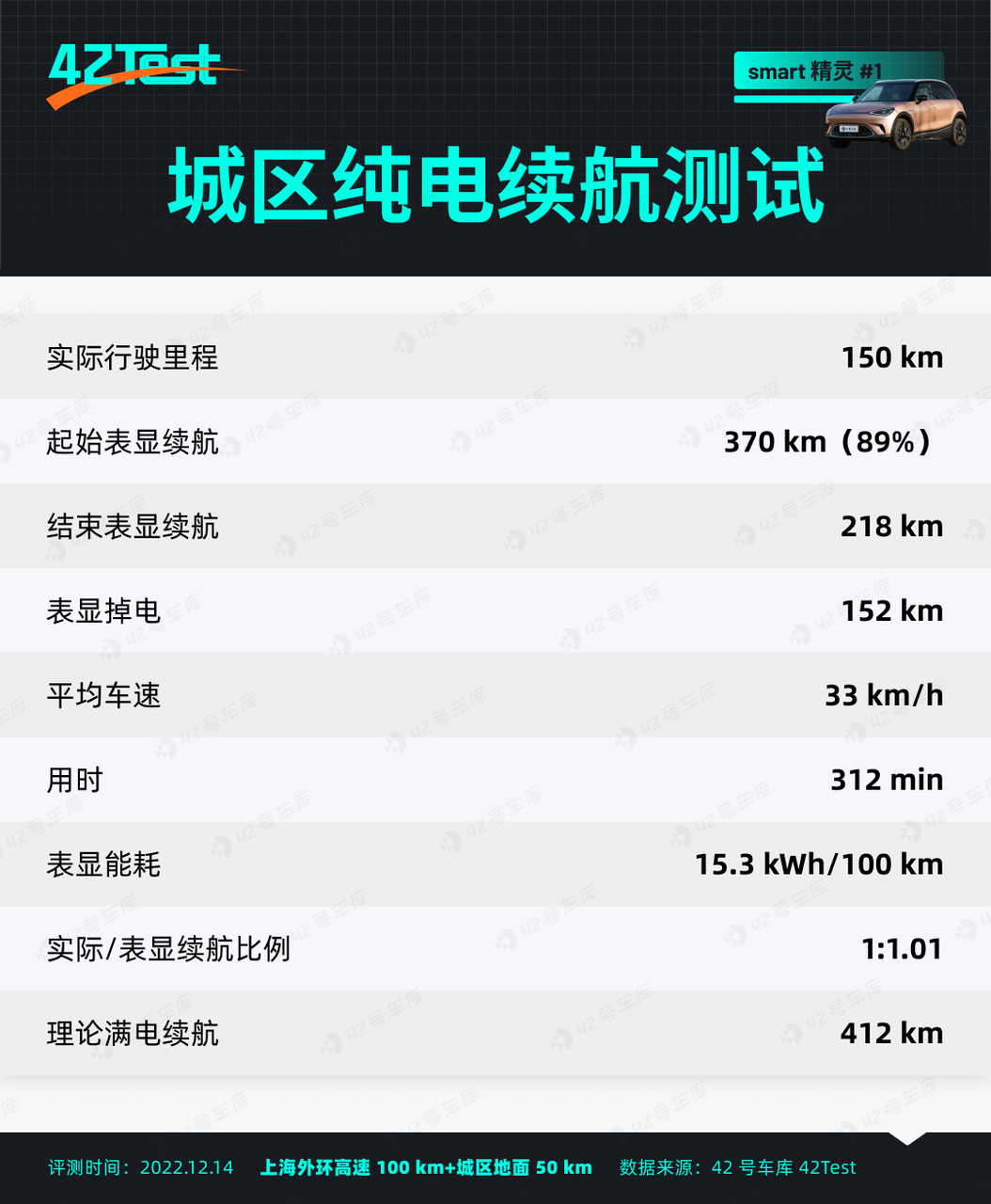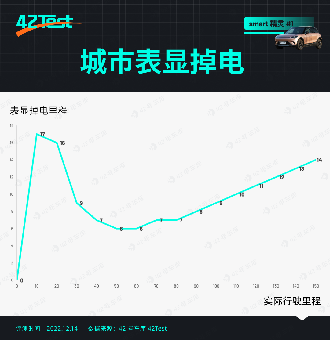出发时车辆的表显续航为 370 km,完成 150 km 的测试后,表显续航为 218 km。换句话说,精灵 #1 跑了 150 km 的城市道路后,表显续航仅仅下降了 152 km,掉电比例为 1:1.01。经过计算,精灵 #1 的满电城市续航达到了 412 km。
