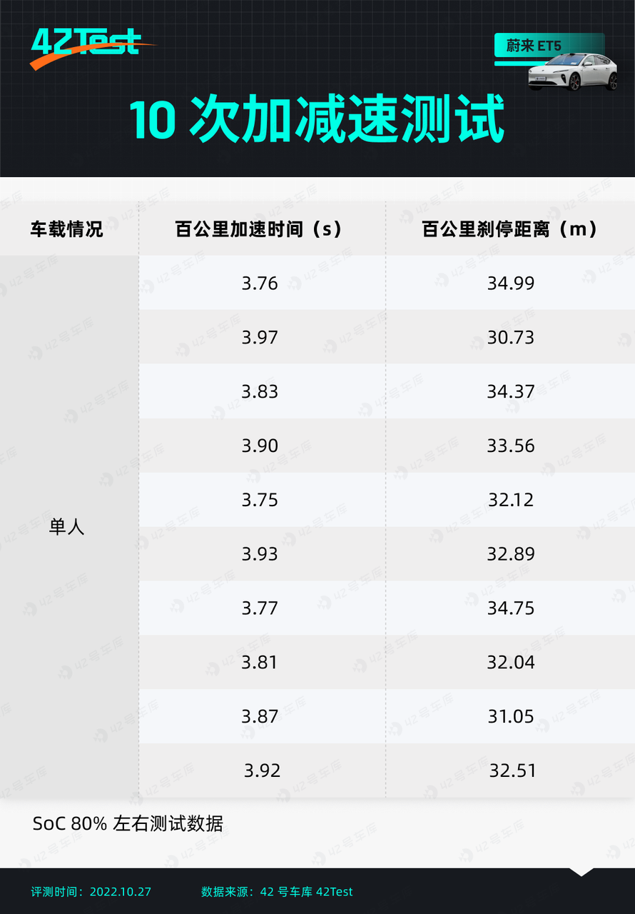 按照惯例,我们依然在同样的封闭道路中,连续进行了 10 次百公里加速测试和 10 次百公里刹停测试。测试时,车辆的电池电量为 95%,胎压都为 2.5 bar,关闭空调以及所有的驾驶辅助功能(不包括 ESP),单人测试,具体成绩如下。