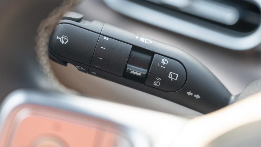 方向盘左侧拨杆为雨刮相关控制,右侧拨杆为电动车流行以及奔驰经典的怀档设计。