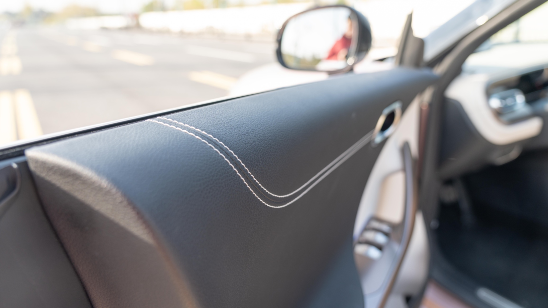 车门采用了深色和浅色混搭的风格,深色部分为真皮包裹,浅色部分则是塑料材质。但由于采用了浅色的配色,看起来并不会显得廉价。