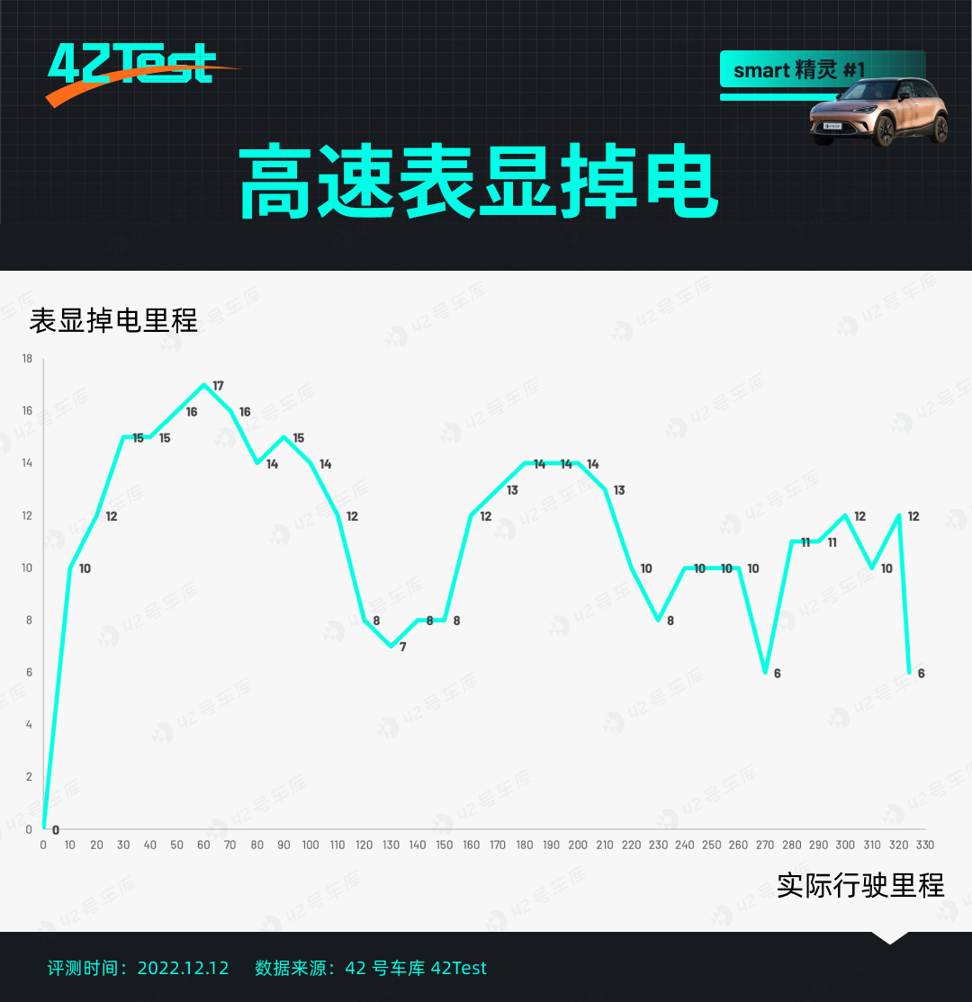 同时精灵 #1 的电池容量仅有 66 kWh,测试过程中还开启了 24 °C 的热空调。从每 10 km 的表现掉电数据可以看出,在路况较为通畅的情况下,精灵 #1 每 10 km 的掉电大约在 12—14 km 的区间。