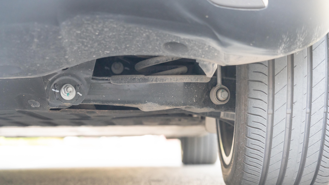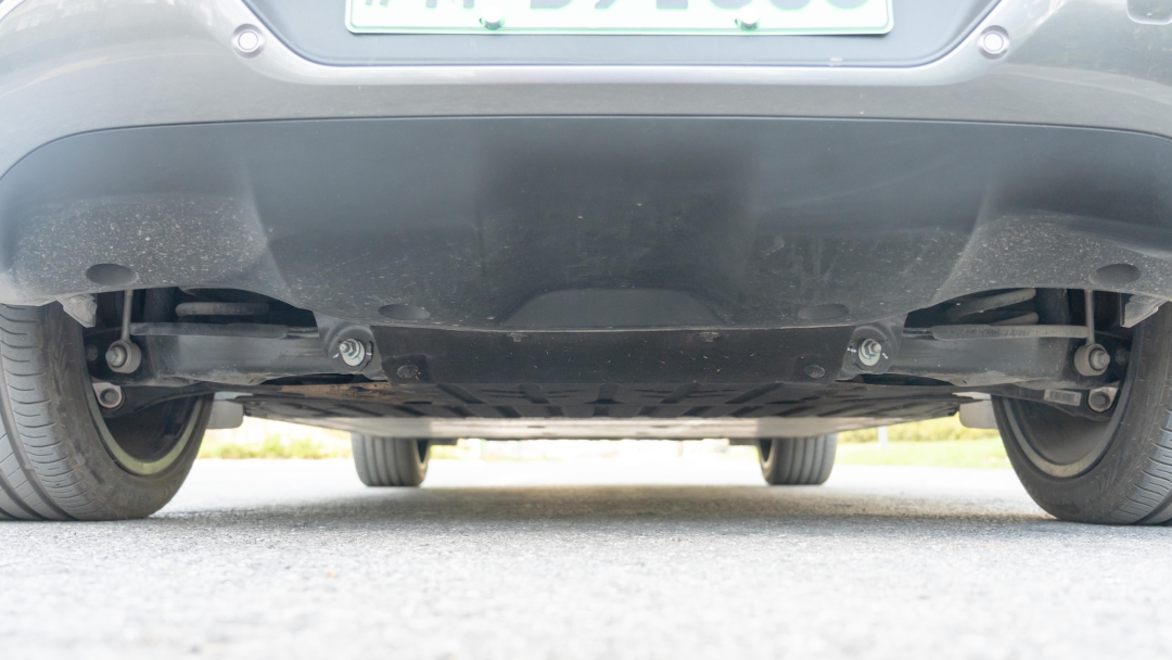 从下方可以清晰地看到底部电池包的黑色护板,以及后五连杆的悬挂结构。
