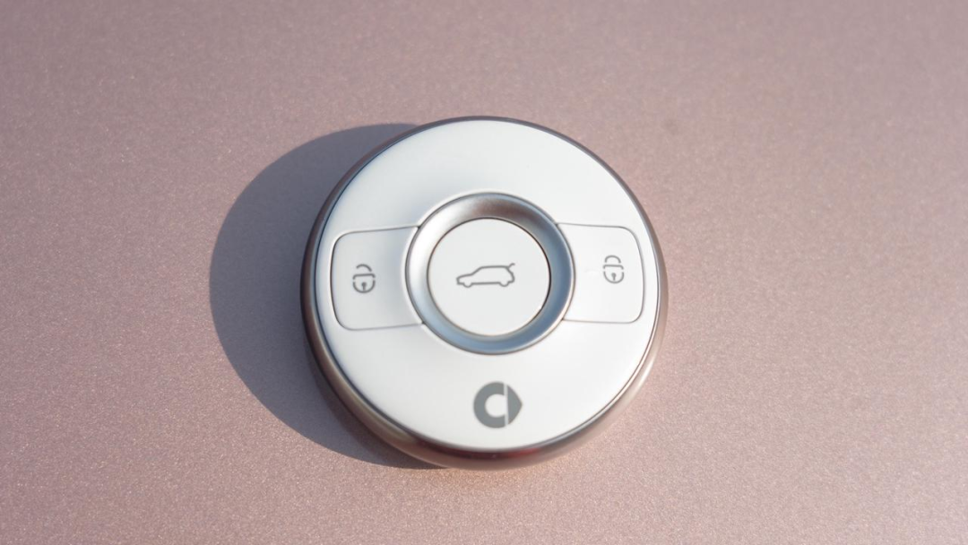 最后展示一下 smart 精灵 #1 的车钥匙,采用了正圆的造型,白色与金色的搭配,拿在手里有点像之前流行的指尖陀螺。钥匙只有上锁、解锁和打开后备箱三个功能,同时支持靠近车辆解锁和远离车辆上锁。