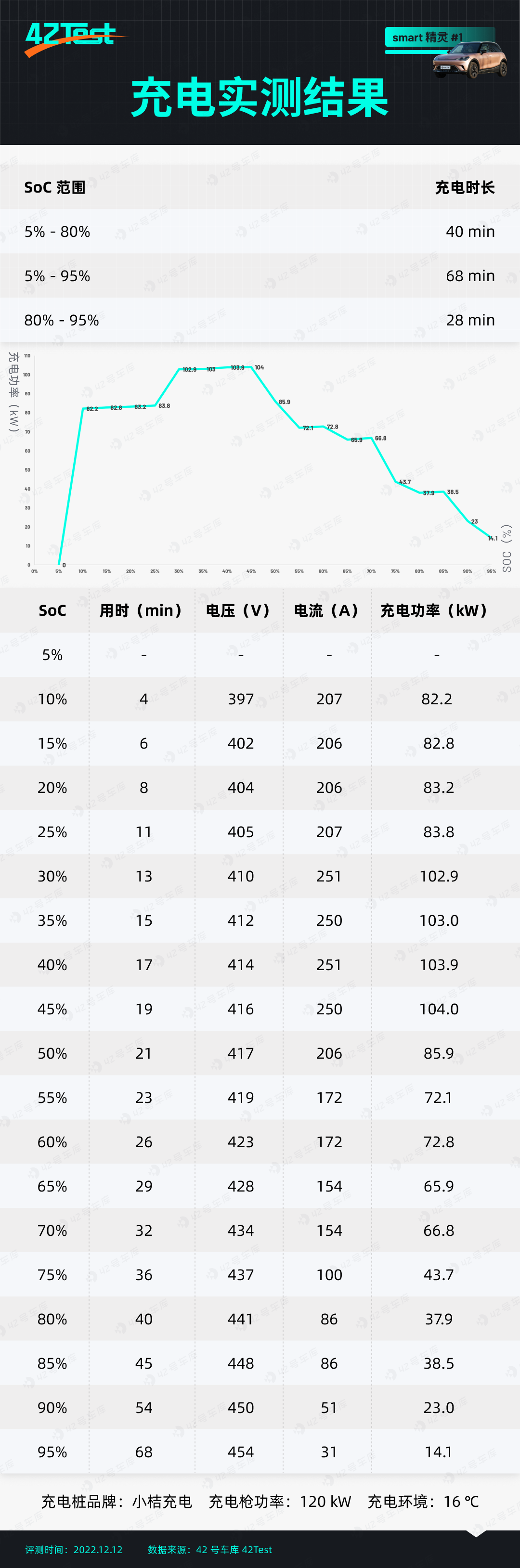可以看到,smart 精灵 #1 在电池电量达到 30% 以前,充电功率都在 83 kW 左右。电池电量在 30—50% 时为最快补能区间,充电功率超过了 100 kW。但从 50% 开始,充电功率开始逐步下降,当电池电量达到 80% 时,充电功率已经降至 40 kW 以下。达到 90% 后,充电功率仅有 23 kW 了。