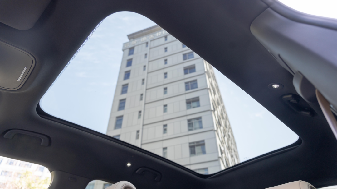 顶部天窗采用了一整块的玻璃,在天气炎热的时候可以关上遮阳帘防晒。