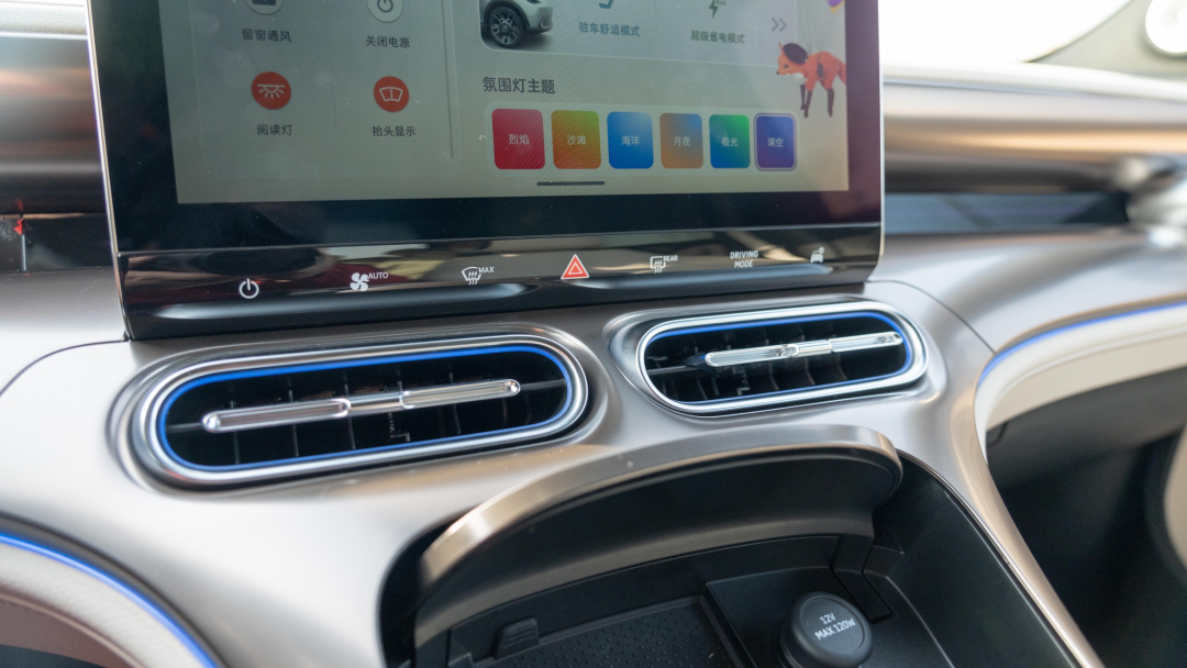 中控屏下方还保留了七个触控按钮,下方的空调出风口采用了圆形的物理调节设计,与整个车辆无处不在的圆润设计相呼应。