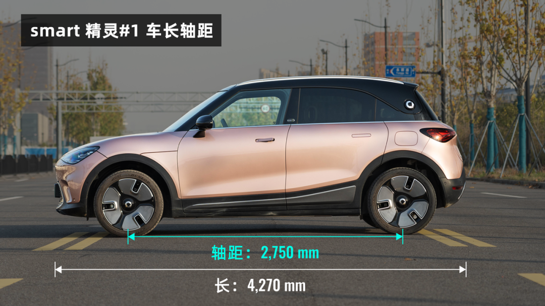 smart 精灵 #1 的三围尺寸为 4,270 x 1,636 x 1,822 mm,尺寸上属于典型的小型 SUV ,长度和轴距与大众 ID.3 较为接近。但 2,750 mm 的轴距在一众小型 SUV 绝对是数一数二的长度,也暗示了其车内空间会有惊喜。