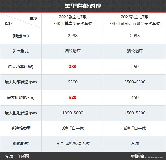 动力部分,二者虽然都采用了B58直列六缸3.0T涡轮增压发动机,但第七代宝马7系增加了48V轻混系统,并且其发动机在进一步升级后,最大功率比上一代7系高出30kW,最大扭矩高出70N·m。传动方面,二者都采用了8速手自一体式变速箱。