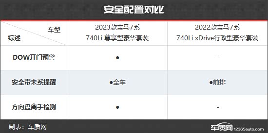 新老7系在安全配置方面都表现的相当优秀,对于百万级车型来说最基本的并线辅助、车道偏离预警、车道保持、道路交通标识识别、主动安全/主动刹车、疲劳提醒、前方碰撞提醒、前/后驻车雷达以及360度全景影像等功能一应俱全,除此之外在细微的地方,第七代宝马7系略胜一筹,其多出了DOW开门预警、后排安全带未系提醒以及方向盘离手检测功能。