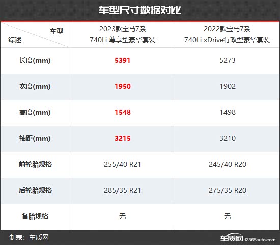 在车身尺寸方面,第七代宝马7系的车身尺寸全面超越了上一代车型,而由于动力参数的升级,与之匹配的轮圈和轮胎尺寸也有所增加。另外,由于宝马始终喜欢采用缺气保用轮胎,所以新老车型都是没有备胎的。