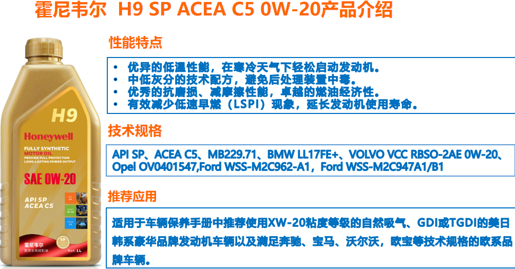 以霍尼韦尔H9系列的0W-20机油为例,该款机油符合奔驰MB229.71、宝马 LL17FE+标准,同时还符合福特M2C947A1/B1标准,以及较为罕见的沃尔沃VCC-RBS0-2AE标准。