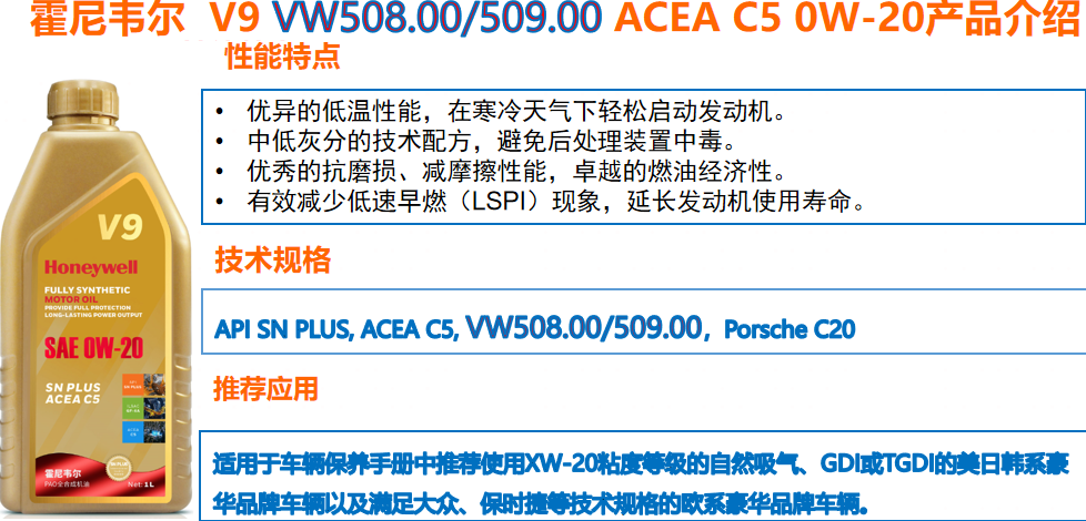 而同样作为霍尼韦尔高端系列的V9系列,则是采用了“PAO”技术,四类(聚α烯烃)基础油的运用,赋予了V9系列机油优异的优秀的长效性、清洁性、性能稳定性。以V9系列的0W-20机油为例,该款机油符合大众VW508/509、保时捷C20标准。