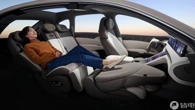 二排右侧座椅支持“零重力模式”以及“躺平模式”,前者坐垫与靠背之间的夹角为121度。两个模式的副驾驶座椅靠背都会完全放倒,成为后排座椅的脚托。