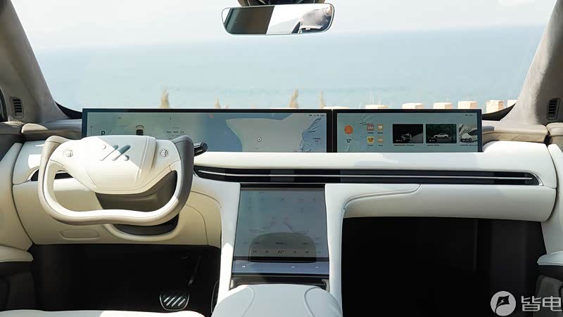 3.内饰方面有很多亮点,例如26.3+15.5英寸的可升降屏幕,还有2㎡的穹顶天幕,天幕玻璃采用三层镀银技术,能有效隔绝热量。另外它也是国内首款配备异形方向盘的车型。